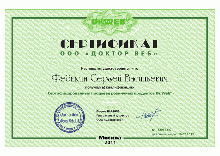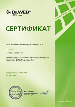 В ООО «Сервис Групп» работают сертифицированные специалисты по продажам продуктов Dr.Web и администрированию их в среде Windows.