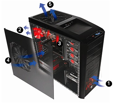 - Вентиляция: спереди кулер Red LED 120 x 120 x 25 мм или модель 140 x 140 x 25 мм, сзади TurboFan 120 x 120 x 25 мм (1300 об/мин,17 дБА), боковой и верхний «бесшумные» 230 x 230 x 20 мм, плюс место под установку ремонт кулера для системной платы (70 x 70 x 10 мм)